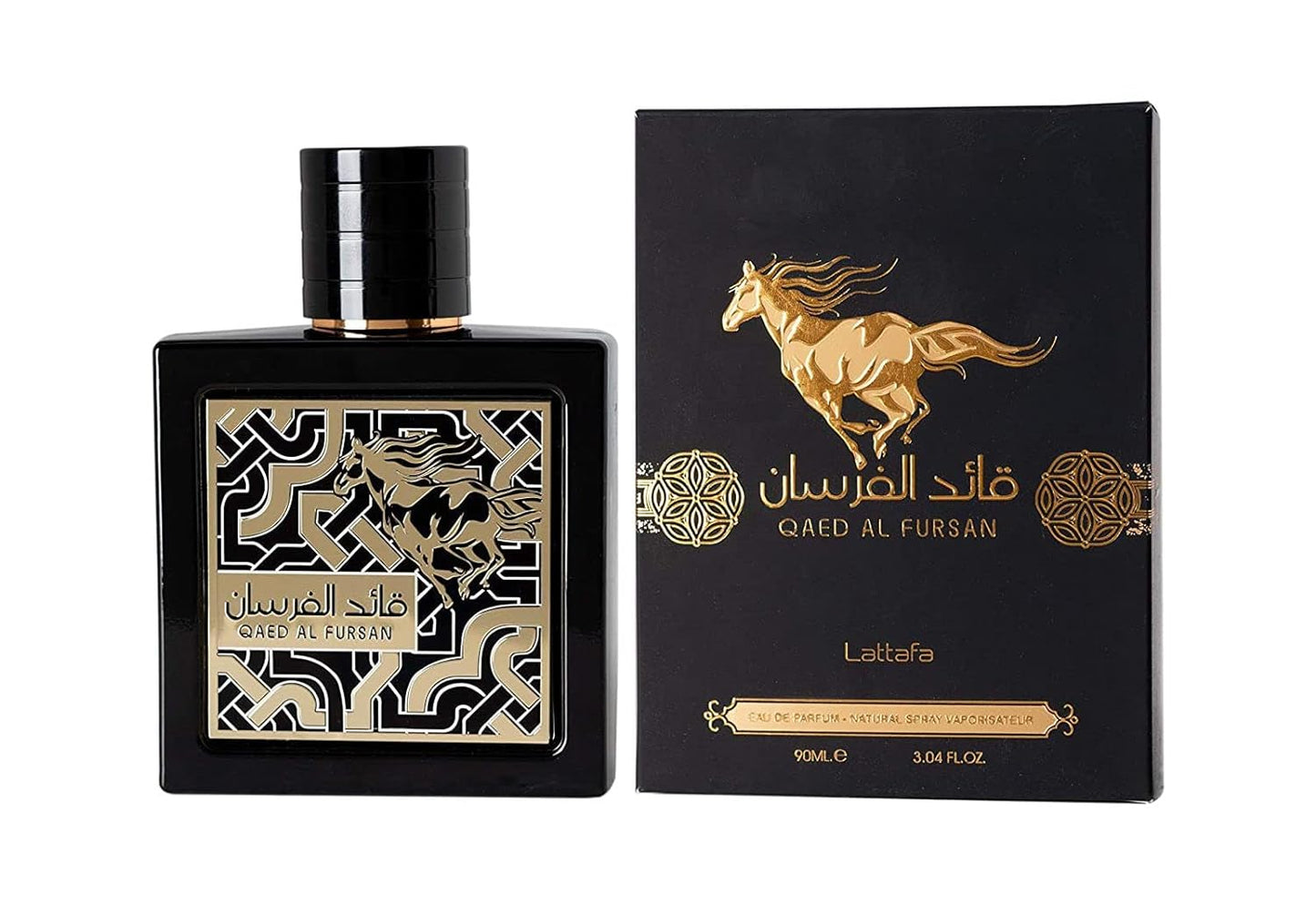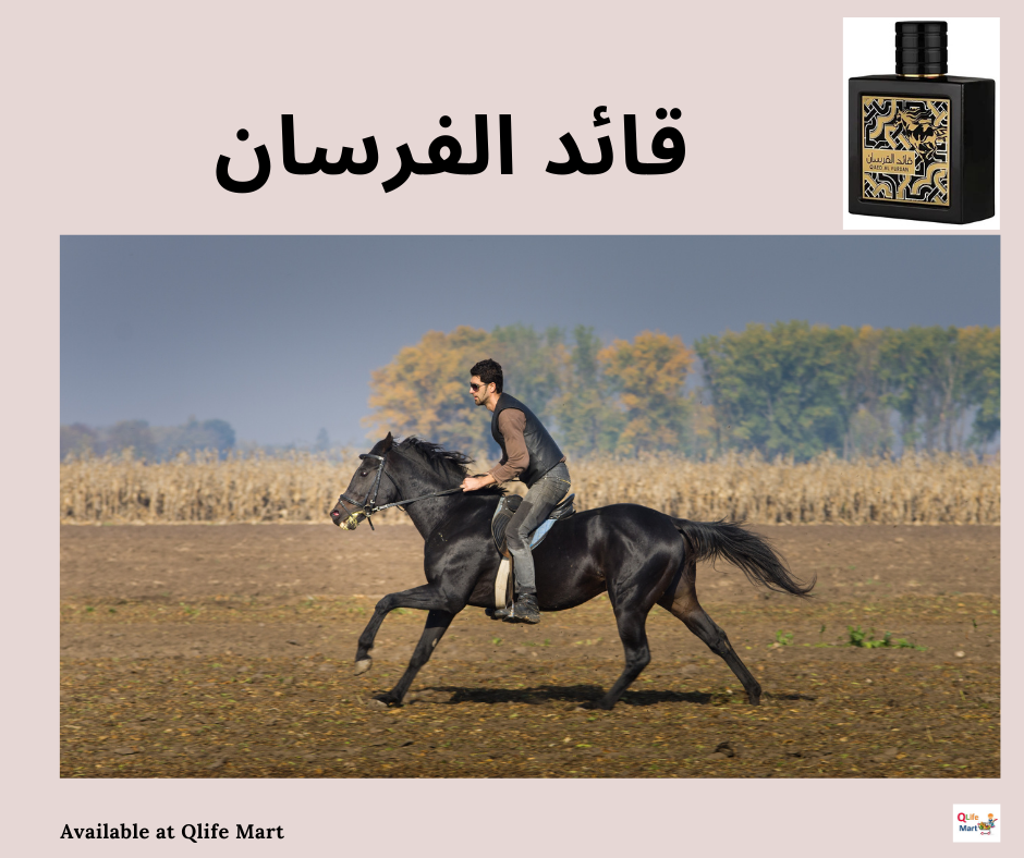 Encased in a sleek black square bottle adorned with gold engravings of wispy designs, Qaed Al Fursan embodies sophistication and allure, making it a captivating addition to any collection.